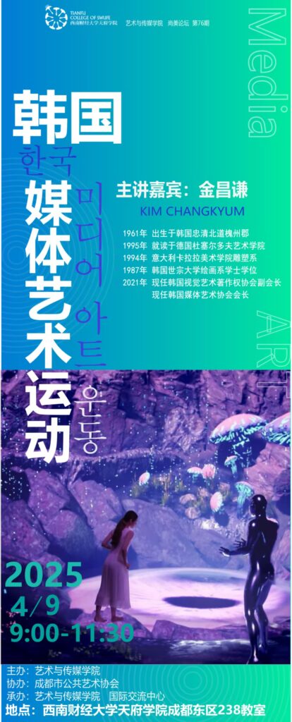 2025. 4 서남재경대학교 중국 쓰촨성 청두 서남재경대학교 세미나 <한국미디어아트운동> 포스터 <한국 미디어아트의 움직임> 세미나 발표 기차에서 만난 친절한 아저씨 . NEXT > 2024 후난박물관 세미나 .